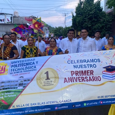 En el marco de nuestro Primer Aniversario, la Universidad Politécnica y Tecnológica del Istmo de Tehuantepec celebró con una gran calenda universitaria, recorriendo las principales calles de la población, donde estudiantes, docentes y personal se unieron con entusiasmo y alegría para dar vida a esta fiesta que refleja nuestra identidad y unidad.